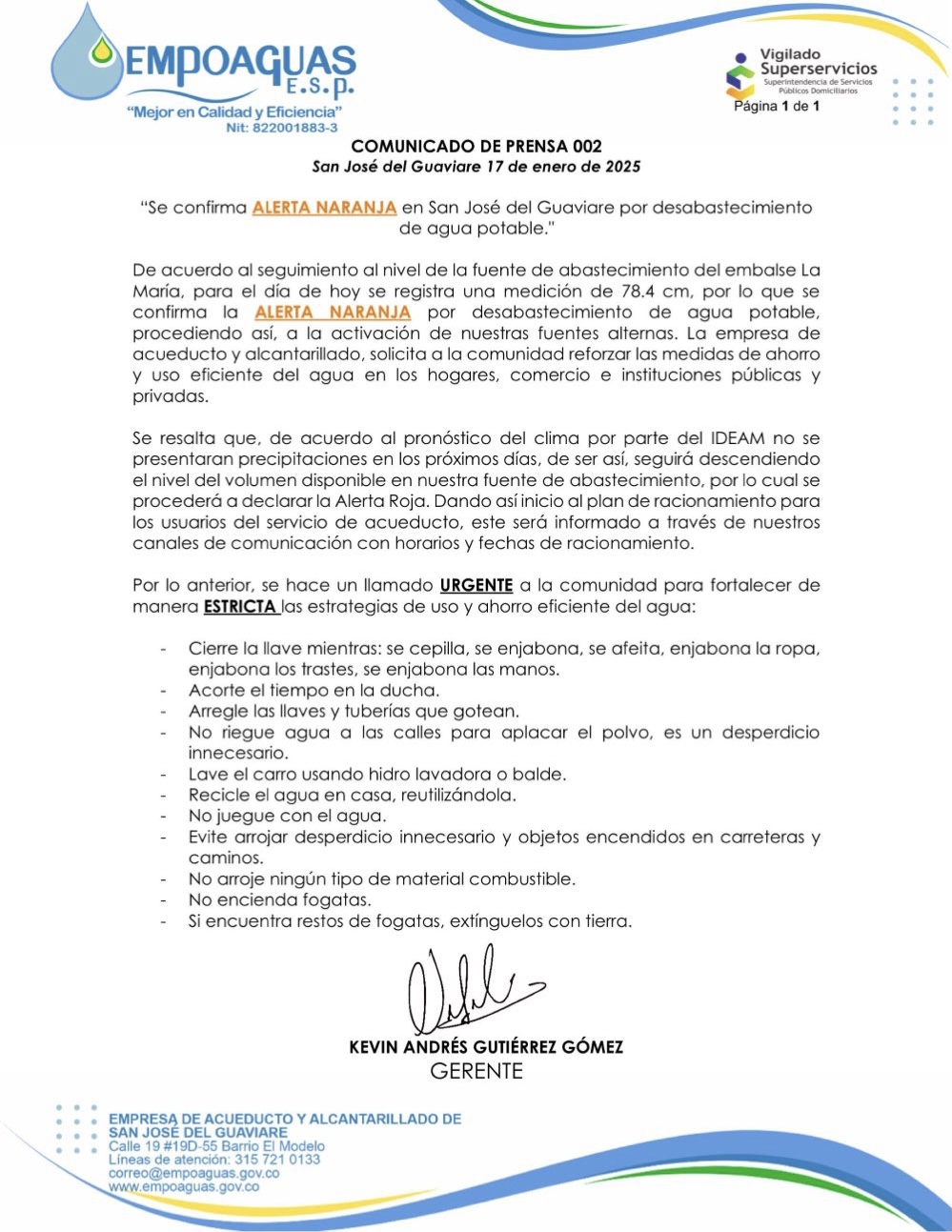 “Se confirma ALERTA NARANJA en San José del Guaviare por desabastecimiento de agua potable.»